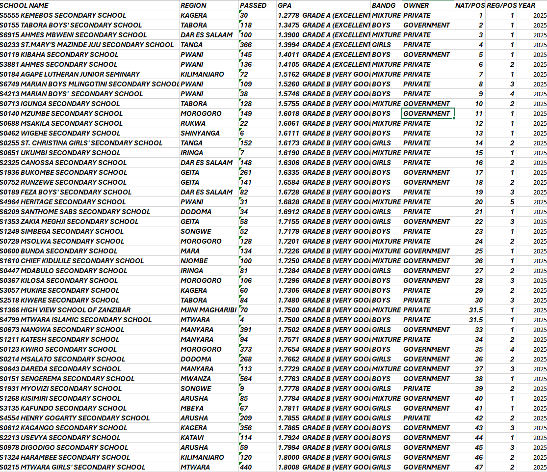 Msalato Girls has a long history – it was established by Anglican missionaries and later nationalized, but it retained a strong academic culture. Over the years, it consistently produced solid results, but 2024’s outcome propels it into the elite category, possibly its highest placement in recent memory. The school focuses on empowering young women from central Tanzania, offering both science and arts combinations.